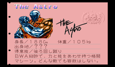 ![]() "I'll finish you so fast, you won't have time to scream." SCORPION (JP: The Astro) Affiliation: BWA Height / Weight: 6' 2" / 231 lbs. From: Unknown whose past and face are a mystery to everyone.