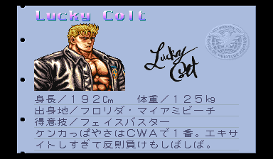 | ![]() "I will gun you to pieces!" (JP: Lucky Colt) Affiliation: CWA Height / Weight: 6' 4" / 276 lbs. From: Slam Town, USA rival to Biff, he's absolutely not related to that Sonic Boom guy. |