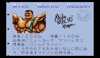 | ![]() "Your neck is gonna be a lot shorter when I'm through with ya!" "MACHO" HAGGAR Affiliation: CWA Height / Weight: 6' 7" / 309 lbs. From: Metro City, USA Mike was busting heads in the ring instead of on the streets.