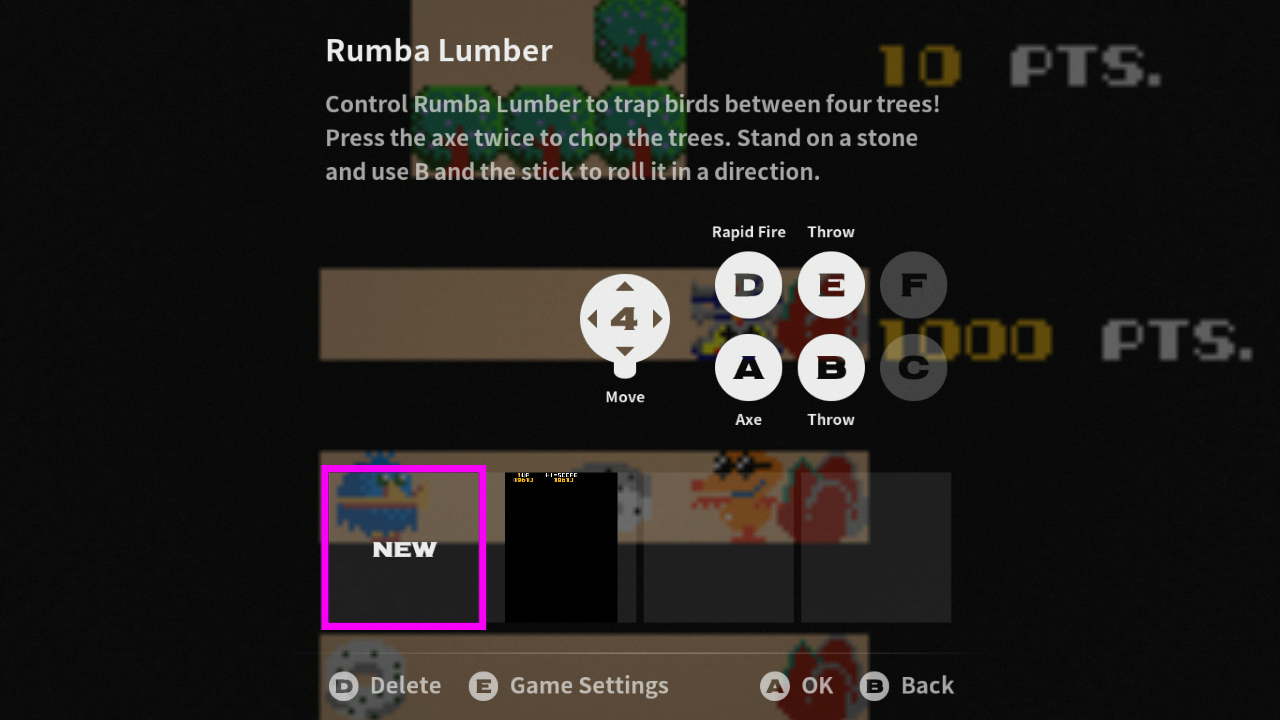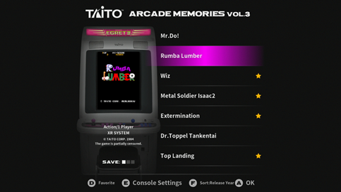 Rumba Lumber was one of the 10 titles included in the Arcade Memories Vol. 3 expansion pack released in December 2024 for the Taito Egret II Mini plug-and-play console, originally released all the way back in 2022. It's pretty much a direct emulation with only two things to really note- first, the language option is not present so the attract mode and Training Stage instructions are in Japanese, and the menu notes that 'this game is partially censored', by which they mean the insert coin noise has changed from the Godzilla roar to a less infringing creature noise. This is your only option for now, but on the bright side, you get Top Landing and Wiz to play with it as well, probably better options!