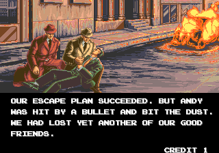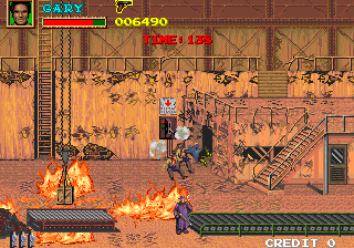 From Robotron: 2084 and Smash T.V., Dead Connection takes the basic game mechanics. In a confined area, with no scrolling whatsoever, enemies will constantly pour in and you have to take them out. Unlike its predecessors, Dead Connection doesn't use a twinstick control scheme, but this doesn't detract from the game at all. Instead, you have a normal joystick, a Shot button (the game will auto-aim for you, tilting shots to the left or right where appropriate, and you get a melee attack) and the Dodge button, something the game nicks from Cabal and the like. This button can be used to duck in place, or dive to avoid damage and, critically, kill enemies if you crash into them. This makes actually avoiding enemy fire a bit easier, and encourages you to keep hopping about, knocking over gangsters and avoiding fire. Overall, the game goes at a slower pace and has less enemies, but the relatively confined space is very reminiscent of Williams' arena shooters, and its additions in the form of dodging (and a health meter) work well.