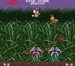 As the adorable Yanmer (complete with propeller hat), your mission is to destroy the Burgoid monarch and save mankind from disaster. The Burgoid, as the name suggests, is a tribe of pissed-off insects, and so at least the game has an interesting visual theme- no spaceships or intergalactic battles here, the conflict takes place in your very own back yard, which leads to a hilariously awkward sense of scale, as well as an army of bees, ladtbirds, ants, and even snails join in. It's all very bright and colourful- Taito's trademark in those days- and the goofy expressions make it stand out a little, visually at least, from the other shoot-em-ups of the time.