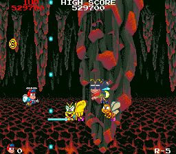 The thing is, the game itself is pretty average in its execution, and this is the main problem- it doesn't do anything offensively bad, but it's not too interesting or noteworthy either. It's just a typical side-scroller with a few cheap shots here and there, and it nearly redeems itself with an interesting weapon system. As well as the standard shot, you can pick up insect cans left behind by bigger bugs which flash between blue and brown, and these serve as your sub-weapons. Blue cans are your anti-air weapons such as missiles and orbs that circle your ship, while brown cans are your anti-ground weapons like depth charges and cannisters that sit on the ground and spew bullets everywhere. Collecting more than one changes the weapon completely, rather than merely upgrade it. It's nice that they gave you a little variety with your sub-weapon, but they give you the most powerful anti-air attack first, thus defeating the point of experimenting with them. Poor show, Hot-B.