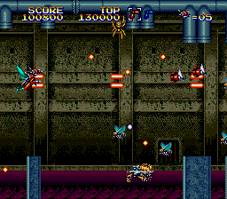 Insector X for the Mega Drive looks totally different from its arcade counterpart, and not necessarily for the better. The cute, vibrant graphics are replaced with more realistic ones, which also affect the game itself- your character is now bigger and has an awkward hit-box. There are a few other changes, though- rather than having to choose between anti-air and anti-ground weaponry, picking up the special weapon item lets you switch between both at any time, you can hold a bomb and use it when you like, the general difficulty has been toned down, and some of the odd 'filler' screens- usually shoehorned in front of a boss- are removed. It's a more refined game as a result, with some of the fat trimmed and the odd touch-up here and there- in other words, it's the game the arcade version should've been.