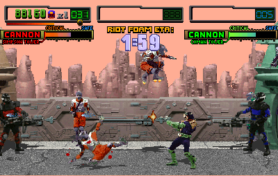 Enough of the history of the game's release, Judge Dredd isn't like other scrolling brawlers of the time period. With a button layout apparently borrowed from NASA (actually borrowed from NARC), each of the three stages (oh, wait, they're called Waves in this game) are actually very different from one another. Wave 1 is a typical side-scrolling stage where you have to beat up thugs (and giant rats), Wave 2 gives Dredd his Lawgiver gun (which you can aim straight ahead or angled up) and also adds some rudimentary platforming into the mix, and Wave 3 is the most interesting. You have to kill Block War thugs with your Lawgiver and four different kinds of ammunition, but the catch is that both Block War sides are developing a death cannon, represented by a meter, and killing block warriors keeps the meter of their side from dropping for a second. If either side fully develops their cannon, you have to start again with a reduced time-limit. This is a nice bit of variety in a genre that's otherwise characterised by being the same thing over and over again, so kudos to Midway for that, and since the brawling itself is solid enough- not perfect, as it adds confusing eight-way attacks- it's pretty entertaining.