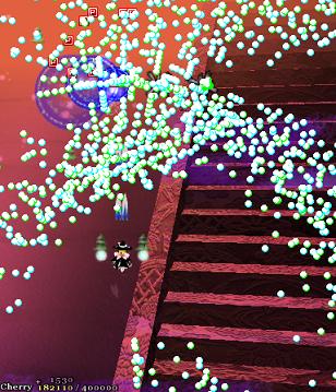 Naturally, the objective is to survive the bullet storm that awaits you- as with every Touhou game- but this is the first in the series to have The Thing in the CornerTM, and for this game, it's the Cherry Meter. This fills up in a variety of ways- shooting down enemies, grabbing Cherry/Point/Star Items- and the more you have, the more points the normal Point Items are worth... Assuming you grab them at the top of the screen or go above the Point of Collection at full power to grab 'em automatically. Get the purple Cherry number up to 50000 and you get a nice gift in the form of temporary invincibility for about 11 seconds. Last through it without getting hit and you increase the maximum amount of Cherry points you can have and a sick score bonus. The Cherry system is the core of the game, and it elevates it over so many other shooters. It's a system that's relatively simple at first, but requires total skill on the part of the player (focused shots bring in less Cherry points that unfocused ones, so managing your shots is important) that rewards them not only with a better score, but also with help when they need it... If they can time when they get 50000 Cherry points well. The balance of score and player benefit, in addition to the constant planning you have to do to get it to work for you, makes you engage with the game- you have to be with it every second to succeed, and that's what a good bullet hell game should do.