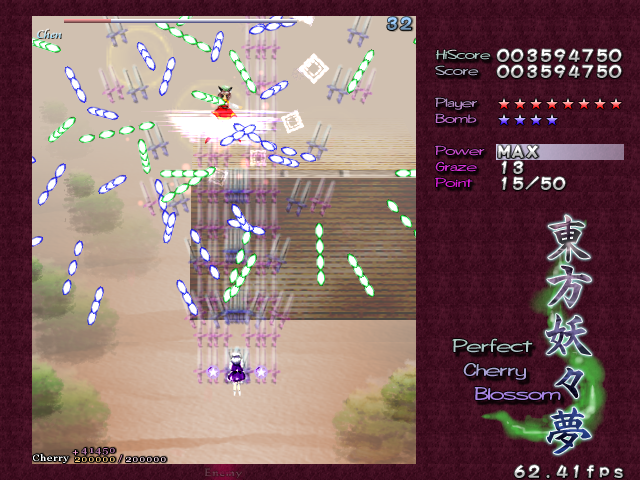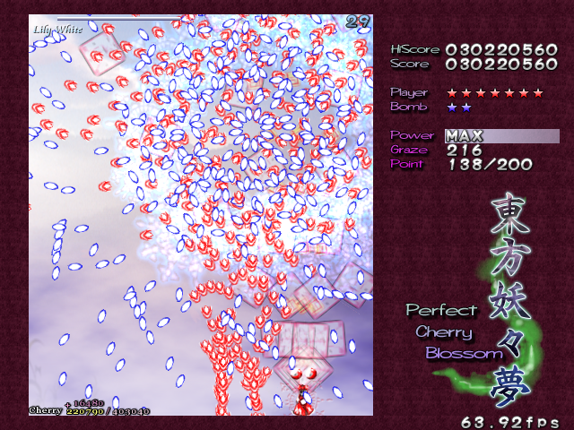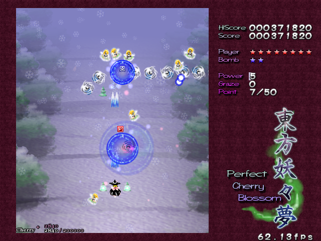 The second Windows Touhou game, Perfect Cherry Blossom is a gigantic improvement on The Embodiment of Scarlet Devil- ZUN clearly learnt a lot from that game's development, as nearly all of the problems found there are eradicated, creating a highly polished and devilishly challenging shoot-em-up. Once again taking up the mantle of Reimu Hakurei, Marisa Kirisame or newcomer Sakuya Izayoi, six stages of curtain fire await you in Gensokyo, covered in snow for reasons unknown. You've got a shot, a screen-clearing bomb, and a focus button that slows you down and changes your shot, and these are all the tools you need! As with EOSD, the characters have two different types to choose from that change their shots, bombs and, in some cases, how they operate, but new in PCB is a second bomb type available only when focused and a greater variety between the characters (including neat special attributes like small hit-boxes and the like).