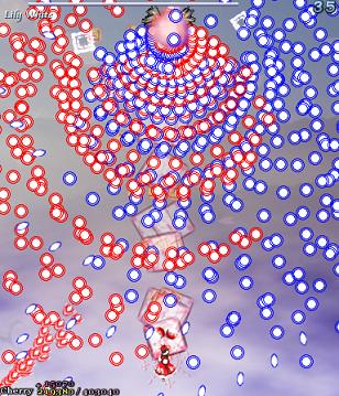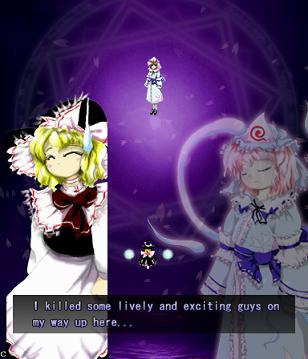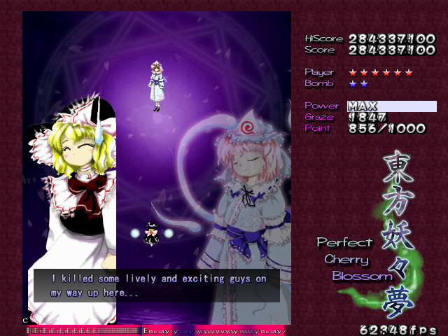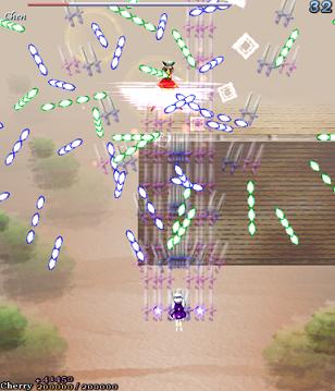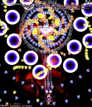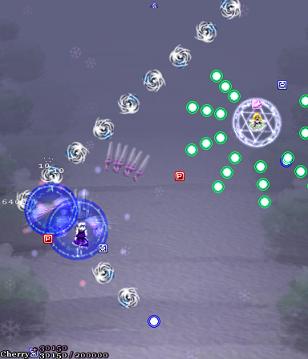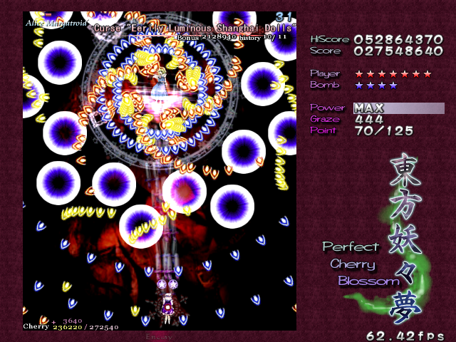 All this would be for naught if the stages themselves didn't deliver, but Perfect Cherry Blossom has a very nice difficulty curve. The first two stages seem daunting initially, but once you play through them a couple of times, you'll get the hang of it. Stage 3 is where the game starts to separate the men from the boys, which is followed through on Stages 4 and 5 (with 4 being a long gauntlet of fairies vomiting bullets everywhere, and 5 being a desperate fight between you and the Crossmatrix of Chaos) and Stage 6 is short until you reach the boss with ten life bars. The bullet patterns you'll encounter range from the vanilla (poor Letty and her pathetic little lasers) and the cruel (Alice and her rotating spheres of death) to the downright sadistic (Yuyuko's chasing lasers are clever and deadly), so there's a little bit of everything, but one thing they do that later games in the series don't is keep the Cherry system going during the boss fights- you'll still get Cherry points off them, and you can use this to time when to get your invincibility.