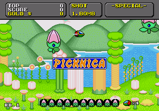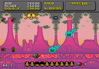 Super Fantasy Zone is kind-of a sequel to the original Fantasy Zone. I say kind-of because it doesn't really add that much, like the Master System's Fantasy Zone II, but it feels more like a sequel than that game, probably because it looks relatively close to its arcade fore-father. If anything, it's more like a mission pack- the same basic game underneath, but with a few new weapons, enemies and backdrops. It helps, of course, that the original Fantasy Zone is a fantastic game (dohohoho, what a terrible pun) but are the changes enough?