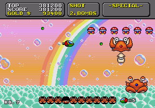 The basics of Fantasy Zone are that you're Opa-Opa, a sentient flying bug thing, and you have to destroy all the Enemy Generators on each stage, indicated by your radar at the bottom of the screen. Like in Williams' classic Defender, you're free to scroll the screen left or right, and the stage loops around for infinity. Fantasy Zone has a few differences, though, mostly in the form of the Parts Shop. Opa-Opa starts out pretty useless, really- all he has is his Twin-Shot (the standard bullet), Single Bomb )a small but powerful bomb that drops from below) and Small Wings. When you defeat enemies, though, they drop coins, and you can spend the cash in the Parts Shop when it appears. Some of the upgrades include time-limited weapons, Bomb upgrades, Special weapons that have interesting effects (like the Heavy Bomb that sends a 16t. weight falling from the sky), extra lives, and other doodads. However, every time you buy a weapon, its price will go up, so you have to be wise with your shopping habits, especially since once you're out of lives, there's no continuing.