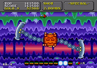 The thing is, the above description applies to both Fantasy Zone and Super Fantasy Zone. There's no major changes in the mechanics, so it feels a bit like a re-hash of the original. Some of the stages are very similar to games from the original arcade game too- there's a grass stage (Plaleaf/Picknica), a volcano stage (Tabas/Kazarne), a desert stage (La Dune/Grandiuss)... It all seems a bit too familiar. To be fair, there are two stages that are quite different- a cavern stage that reduces your field of vision, and a power-plant stage that electrifies the floor- and the bosses manage to avoid being repeats- the axe-head and vacuum-fish bosses in particular are interesting, and take advantage of the fact that Opa-Opa can face both directions during boss fights now- but it still smacks of more of the same. I mean, it's great that there's more Fantasy Zone to go around, it really is, but it really does feel quite familiar...