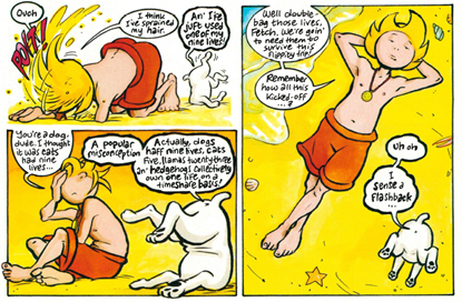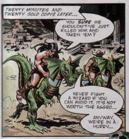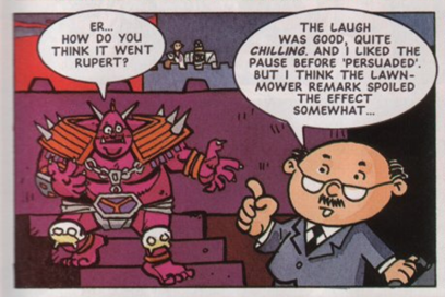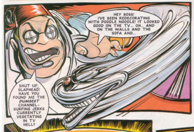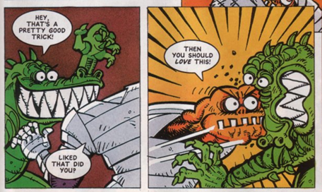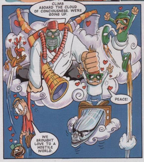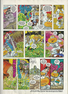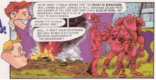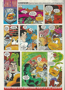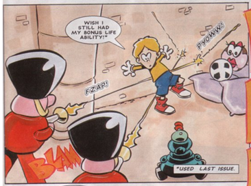 Greendog is of course based on the self-charicature created by Ric Green for a board game, Surf Trip, that was later used as the protagonist for Greendog: The Beached Surfer Dude! because Michael Latham (of Eternal Champions fame) liked the board game's character. Despite having the disadvantage of being on a Mega Drive platformer I would charitable describe as 'a video game', this one is actually kind-of alright- a bit reliant on pop-culture references, perhaps (including a single panel presented for use with 3D glasses) but some of the jokes are pretty good (like the local dinosaurs being more interested in their media profiles due to them being popular at the time) and the presentation is vibrant with lots of exaggerated poses and expressions, even if you only see Greendog's eyes for a single panel. Also, I won't lie, it is incredibly funny to me to find out the Greendog comic was drawn by someone who later did How to Draw Manga books, two things that couldn't be more different. You could've run this in Sonic the Comic and it'd be maybe a few rungs below Mutant League but certainly better than some of the other Max Overload strips! |