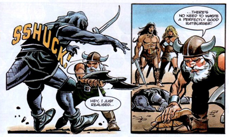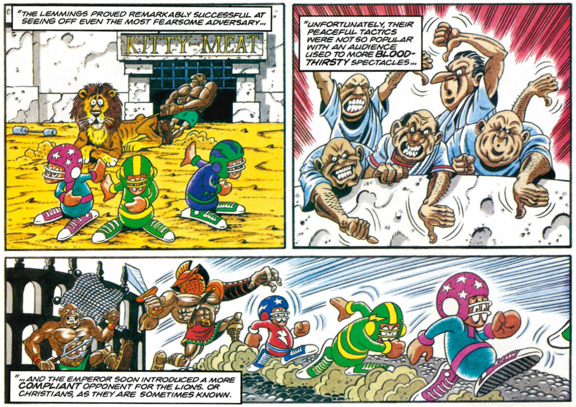 Lemmings is easily the best of the bunch, sticking very closely to the established art-style of the series. The stories have two different framing devices which is a bit unusual- the first is a professor going over historical mentions and legends of the Lemmus Ludicrus (before being hit by a Lemming and subsequently getting run over by a bus) and the second is a group of explorers finding ancient murals and hieroglyphics depicting Lemmings in a cave (before they leave, missing out on a frozen Cave Lemming before it's fried to bits). This means it's less narrative-focused and more a collection of little vignettes of Lemmings in different time periods and countries getting up to all sorts of accidental mischief (albeit with a tasteless joke about Lemmings having too many kids while 'on the dole', oof). The art definitely sells this one, my favourite of the Max Overload! comics by a wide margin. |
