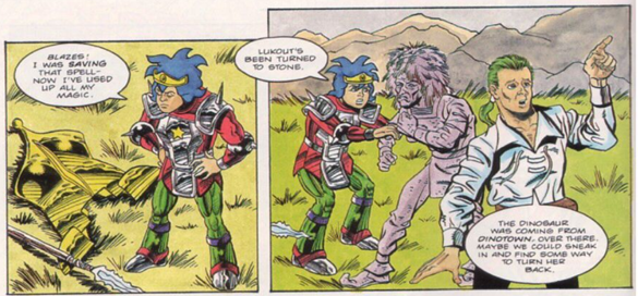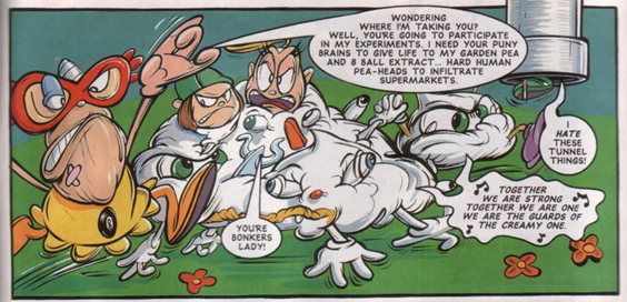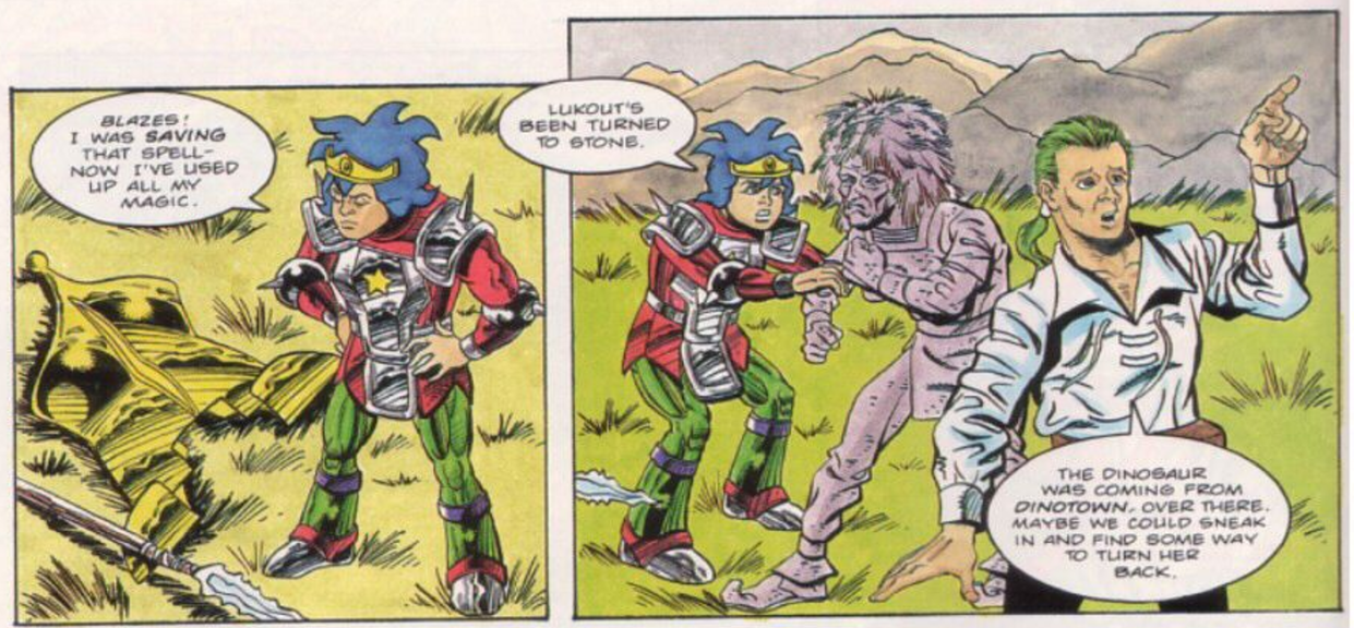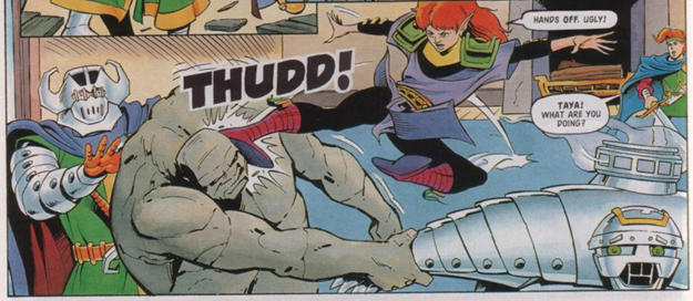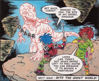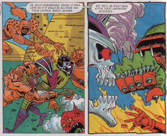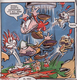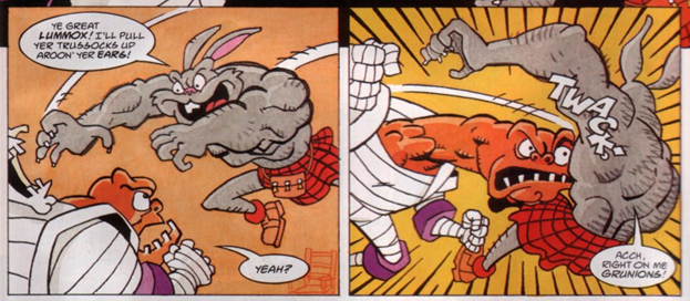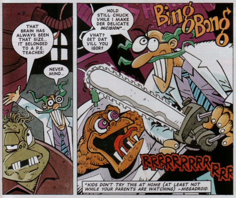Chuck Rock takes places after the second game, with Chuck's wife Ophelia and son Chuck Jr. captured once again alongside his plans for the Model T Fjord, the future of neanderthal travel. And the big race is tomorrow!! Hijinx ensure, and this is certainly the most unique looking of the comics with a very exagerrated albeit rather gross look to everyone and everything. To be completely fair, while the Look-In strips were probably more palatable, if you're going to make a full-on Chuck Rock comic you may as well make it faithful to the games and have the characters all be as offputting and grotesque as possible. There's also a scene where Chuck tries to eat his own son because he's hungry. One for the true Chuck Rock aficionado out there. |