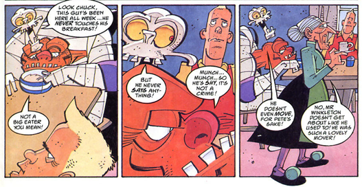 NANNY KNOWS BESTOne-Shot 3, Issue #70 Feb 2, 1996 THE BRIDE OF CHUCK D. HEAD One-Shot 4, Issue #71 Feb 16, 1996 THE PUMPKIN CHASER One-Shot 5, Issue #89 Oct 29, 1996 BORIS & THE BOOK One-Shot 6, Issue #90 Nov 12, 1996 THE LEGEND OF MR. CUDDLE BUNNY Arc 4, Issues #91 - #93 Nov 26, 1996 - Dec 24, 1996 THE HUNGRY GUEST One-Shot 7, Issue #94 Jan 6, 1997 DEAD! Arc 5, Issues #97 - #99 Feb 18, 1997 - March 16, 1997 WALLS One-Shot 8, Issue #101 April 15, 1997 LIFE WITH THE SNAGSBYS One-Shot 9, Issue #102 April 29, 1997 FUNNY OLD GAME One-Shot 10, Issue #104 May 27, 1997 WISH One-Shot 11, Issue #105 June 10, 1997 CAUGHT BY THE PREFECTS Arc 6, Issues #107 - #108 July 8, 1997 - July 22 1997 DREADED POOPLE PLAGUE One-Shot 12, Issue #109 Aug 5, 1997 THE TOOTH One-Shot 13, Issue #110 Aug 19, 1997 THE MALTESE BUDGIES One-Shot 14, Issue #111 Sept 2, 1997 THE FEARLESS MONSTER HUNTERS One-Shot 15, Issue #113 Sept 30, 1997 CHUCK AND THE CHEESE FACTORY Arc 7, Issues #114 - #115 Oct 14, 1997 - Oct 28, 1997 RETURN OF THE PUMPKINS One-Shot 16, Issue #116 Nov 11, 1997 CHRISTMAS CAROL II One-Shot 17, Issue #119 Dec 30, 1997 CHUCK'S SAVINGS One-Shot 18, Issue #120 Jan 13, 1998 LOVE IS BLIND One-Shot 19, Issue #123 Feb 24, 1998 DOG One-Shot 20, Issue #125 March 24, 1998 MOTHER One-Shot 21, Issue #126 April 7th, 1998 THE DUNGEON One-Shot 22, Issue #129 May 19, 1998 BIRTHDAY One-Shot 23, Issue #130 June 2, 1998 DECAP-MAN Arc 8, Issues #131 - #132 June 16, 1998 - June 30, 1998 ![]() Script: Nigel Kitching (Arcs 1 - 3 & 8 + One-Shots 1, 4 & 17 - 23) Nigel Kitching & Richard Rayner (Arcs 4 - 7 + One-Shots 2 - 3 & 5 - 16) Art: Nigel Kitching (Arcs 1 - 4 & 6 - 8 + One-Shots 1 - 7, 11 & 14 - 23) Mick McMahon (Arc 5 + One-Shots 8 - 10 & 12 - 13) Lettering: Steve Potter (Arcs 1 - 2 & One-Shot 1) Tom Frame (Arc 3 + One-Shots 2 - 4 & 13) Ellie deVille (Arcs 4 - 6 & 8 + One-Shots 5 - 12, 14 - 15, 17 - 19 & 21 - 23) Elitta Fell (Arc 7 + One-Shots 16 & 20) |