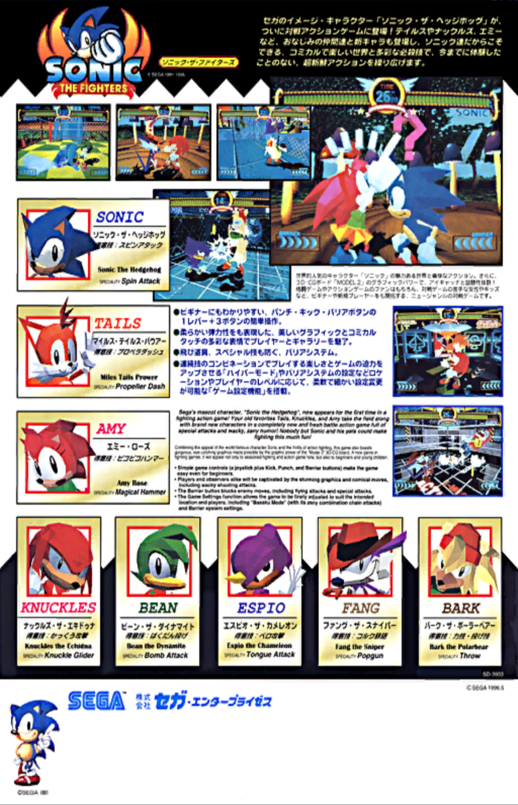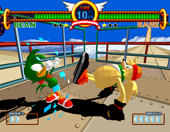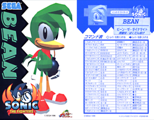 ![]() From: Sonic the Fighters (1996) Full Name: Bean the Dynamite Speciality: Bomb Attack Home Stage: Dynamite Plant Dynamite Düx, he sure takes after him with his penchant for explosives.