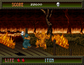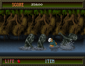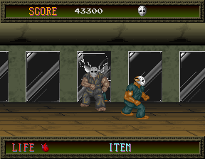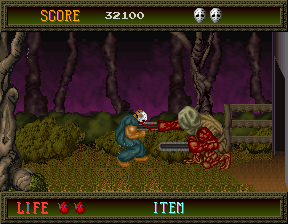 The story of Splatterhouse is pretty simple, although later games in the series flesh things out a bit. Poor Rick (that's you) is having a bad day- he's been left for dead in the sinister West Mansion, with his girlfriend Jennifer kidnapped by the mansion's grotesque inhabitants. Fortunately, the Terror Mask, an ancient sentient relic, has given Rick another chance by attaching itself to his face, granting him immense power. Rick must now smash his way out of the Splatterhouse and save his girl! As brutality is the order of the day, it's no surprise that the game's brutally simple. Since Splatterhouse was developed in a cruel, horrible world where Final Fight didn't exist, and Namco apparently didn't pay attention to Renegade or Double Dragon, they decided to use the Kung-Fu Master/Vigilante template, i.e. just one plane of movement. You might even say it's simpler than that, because there's only one attack button (unlike the two in KFM) but the second button here is used to jump. Rick has three main attacks: a straight punch, a crouching kick (both of which can be used in the air) and a sliding kick performed by jumping and holding Down and Attack as you hit the floor- he'll slide for quite a distance, so be careful where you use it, but it does twice as much damage as his other attacks. Mastery of the sliding kick, especially the rarely-used-but-important reverse sliding kick (press the opposite direction just as you hit the floor to slide the opposite way) is critical for certain boss encounters!