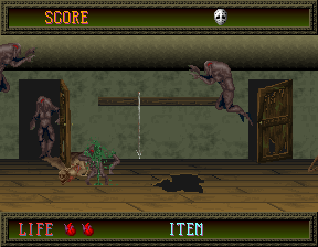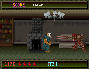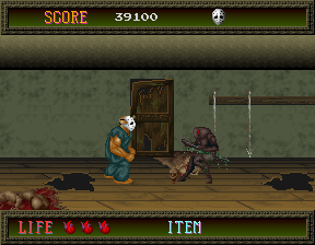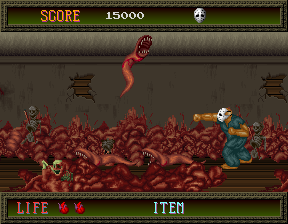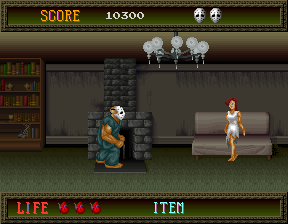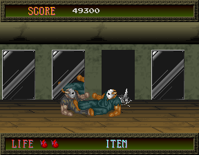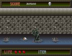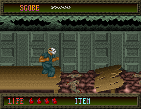 Needless to say, this is the standout moment of the game. In a time when saving your girlfriend/the princess was one of the most common video game plots, Splatterhouse turns it on its head in the only appropriate way- like a twist in the horror films it draws inspiration from. As well as being one of the more gruesome scenes in the series (Jen's transformation is... Nastily detailed) it's also interesting, for an arcade game in particular, in that you get shown this through a non-interactive cut-scene in the middle of a level instead of between scenes. Admittedly there was stuff like the intermission scenes in Rolling Thunder before this used to advance the plot, so to speak, but those were static affairs divorced from the game itself- when Jennifer transforms here it's all done as if part of the game itself, right in front of you. It's laid out like it's part of a stage but you have no control, so you can't do anything to save her. It's a tiny thing, I know, but it adds a little to the horror of the situation. Just a thought, like.
