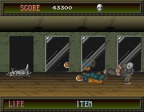 Oh boy, it's our best pal, Mirror Rick again! This time he's hiding out in a room of wardrobes littered with women's clothes. There's less mirrors here, so each one you see will spawn a Mirror Rick. The approach is pretty much the same as it was on the last level- either punch then reverse slide-kick, or just go for the reverse slide-kick from the off. Really, I'd try and avoid this room if I were you, simply because Mirror Rick is pretty hard to deal with. Fortunately, taking the right route means you won't have to go here or even visit the next room, which I dislike even more somehow.