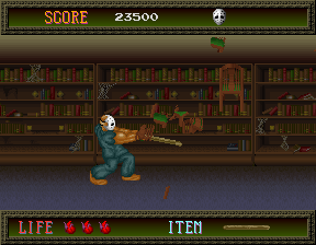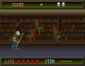 Before we get to choose our path, though, Rick must pass through a library full of chairs! A whole bunch of possessed chairs, back from the Poltergeist fight on Stage II, bounce around this small library area. This is a pretty short segment mostly because at the beginning you're given a two-by-four to do some serious carpentry on these four-legged furniture fiends. [You're fired, for excessive alliteration - Ed] Admittedly, it's slightly more fun to punch them because, like in the Poltergeist fight, you catapault them across the room when you do, but if you want to get through without getting hurt (PROTIP: you do) then grab the two-by-four and get crackin'.