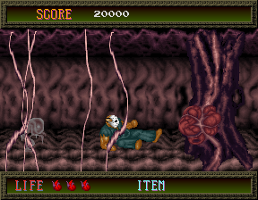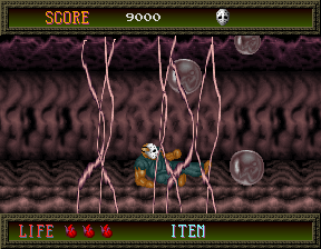 There's not much to this stage- it's just one fleshy corridor, a straight line to the end- but it's auto-scrolling and the only enemies you'll find here are the most aggravating in the game, the Egg Obas. These mutant eggs constantly spawn from both the floor and the ceiling, then they'll float around before they hit the floor, giving birth to little white creatures called Obas (see, this is why we call it The Womb) that squeal upon spawning then try and mate with Rick's back. If one latches on, just like the Body Eaters you've got to waggle the joystick and smack the buttons to get them off, and you'll want to do that fast because the more time you waste getting one Oba off, the more you'll allow to spawn around you, and if you're surrounded, you're as good as dead.