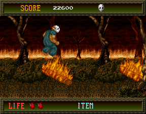 As the fire rages on in the background, you've got a small obstacle course to make your way through. You'll mostly be hopping over burning logs (the margin of error here is pretty small, so make your jumps high and true!) and, as you cross over a bridge, flaming ghouls (apparently Deadmen set on fire- the Deadmen in the ruins of West Mansion at the start of Splatterhouse 2 are all horribly burned, so they might've survived, just about) will rain from the sky and jump in set patterns. There's nothing to this section, really, except when two burning logs roll by together- you need to nail that jump bang-on otherwise you won't make it. Other than that, this is textbook stuff- jump over the logs, wait until it's safe to pass under the flaming Deadmen, and try not to get hit.