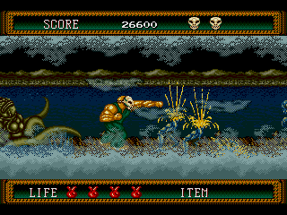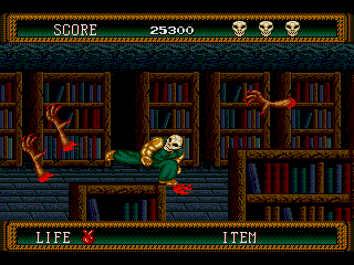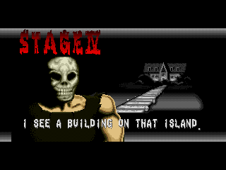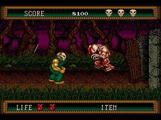 The island itself is one of the weirder segments of the game. First, the primary enemies are Ghouls, which are sorta-like zombies (in that, well, they're dead and rotting) but unlike the very punchable and delicate Deadmen, they have a tendency to get back up- punch them once and they'll go back into the ground, then their spirit rises to resurrect from the ground shortly afterwards. They'll eventually disappear permanently, but you should just keep marching on here, as the other enemy is a bit more annoying. The Spirit (these ones have faces, aahhhh) floats above the ground, take a few punches to knock out, and if they touch Rick, they'll encircle him and reverse your controls. Left is right, right is left. Fun, especially since this area's dotted with Ghouls and pits. My advice? Try and avoid the Spirits, but if one grabs you, march on and keep picking up Spirits so your controls don't suddenly revert to normal. This is especially amusing as gathering enough Spirits will cause some slowdown, if you want to flummox your poor little Mega Drive.