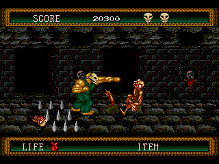 On the plus side, this section has one of the few optional areas of the game- like the auto-scrolling sections, the first Splatterhouse had quite a few of these, but there's less of them in 2. Fall down any of the holes and you'll end up in the... Dungeon? Basement? Dungeon-Basement? You'll still be attacked by Ghouls- these ones stay dead- but killing them drops a weapon you can only find here- a Ghoul Head! Throw it at a Ghoul and it'll most likely sever its legs (must have sharp teeth, I guess) and it'll crawl after you... Which makes it harder to hit, so don't do that. Use it against enemies behind you, and they'll probably get split in half... And crawl off the screen, away from you! So, bear that in mind. The other problem here is the floor- spikes like the ones from Stage II will appear constantly, and not necessarily in set places, so be sure to keep moving.