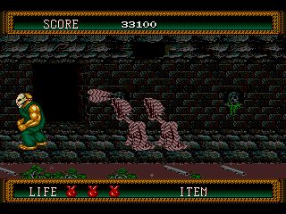 Next! The sewers. The Mud Dead from Stage II are back- different palette this time, y'see- but unlike before, there's no bone club to smash them lying around. Also, they can spit projectiles at you now! It's simple enough to deal with them, but you have to be quick- punch them, then jump over them straight away. If you're too slow, they'll start reforming already, and might be able to catch you while you're jumping over them. You'll also have to watch out for the odd Mud Dead puddle that chases after you from behind- don't ignore it, jump over it and let it pass otherwise you might get trapped between it and other Mud Deads. You also need to watch out for pits, but careful play should get you through here.