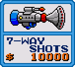 ![]() Wide Beam Initial Cost - $1000 Increases by $800 each purchase Fires a crescent-shaped bullet that's taller than Opa-Opa, but doesn't pass through anything. Useful for stages that get crowded, but only if you've got a fast trigger finger. ![]() 7-Way Shots Initial Cost - $10000 Increases by $4000 each purchase Fires 7 shots at a time in a spread pattern, Very useful on stages like Le-Picker and Aflorious. However, the $4000 price increase every time you buy it is painful. Save it for when you need it. |