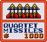 ![]() Quartet Missiles Initial Cost - $1000 Increases by $1000 each purchase 4 of these are launched at a time, homing in on nearby enemies. Don't cause as much damage as the Single Bombs, but they're handy for fending off small enemies. Nice for beginners. |
