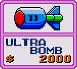 ![]() Ultra Bomb Initial Cost - $2000 Increases by $1000 each purchase Acts much like the normal bombs, except that this one packs a hell of a punch, and when it lands, it creates a huge explosion that takes out small enemies. Very effective on the Niagaro and Risscave bosses.