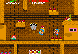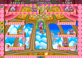 Of course, those of you who are particularly proficient at late-80s arcade games already know the first game that had a cameo of the cast of The Fairyland Story- it's 1987's Rainbow Islands. Taito's classic vertically-scrolling platformer has three secret islands, only accessible to those who collect all the Big Diamonds in the first seven islands (one per world, collected by getting all the Little Diamonds on an island). The first of these three is Magical Island, based on The Fairyland Story. As well as a kickin' remix of the main theme of the game, the Pig Soldier, Mage, Priest, Ghoul and Golem enemies all appear, and even the Worm shows up (as one of the most annoying enemies in the game- he'll leap up out of nowhere then dive-bomb straight back down again). Also, since the game already had a dragon boss on Dragon Island, the boss here is the time-up demon.