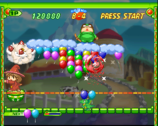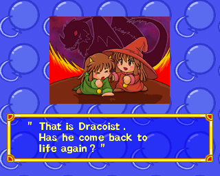 Her biggest post-introduction appearance is in the Playstation, PC and Game Boy Color versions of the slightly obscure Pop n' Pop, a combination of Puyo Puyo and Space Invaders. Originally released in 1998 in Japan (and 1999 in Europe, if the title screen's to be believed), the Playstation port was never released in the USA, so the game's never really gotten the attention of other Taito puzzlers. The GBC port did get a US release... With all the Taito references taken out. The port's bad, too. It's a shame the US didn't get it, as it's one of their best... But let's stay on topic. While the original arcade game, released in 1997, only has four characters (technically eight if you count the second player palette swaps- it seems to have been rushed somehow), the home versions add a slew of other characters, including Ptolemy (renamed Tremi in the European PS1 version, Treymi in the PC port) along with a green palette-swap called Rodomi, apparently her dragon friend from the original game under a curse from Dracolisk (or Dracoist according to the atrocious translation). Additionally, Dracolisk appears as a boss of Rounds P and Q, where he spits fireballs at you, as he is wont to do. There's a few other nods to Ptolemy's original game- she arrives on-screen with her broomstick, conjures cakes when making a combo, and the moon comes out when using her special balloon, just like the special cake-making item- but more attention gets given to games like The New Zealand Story and Bubble Memories (seriously?).