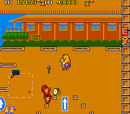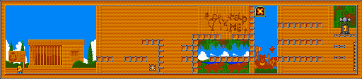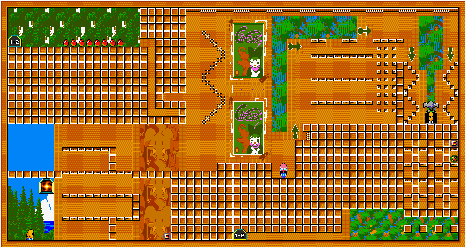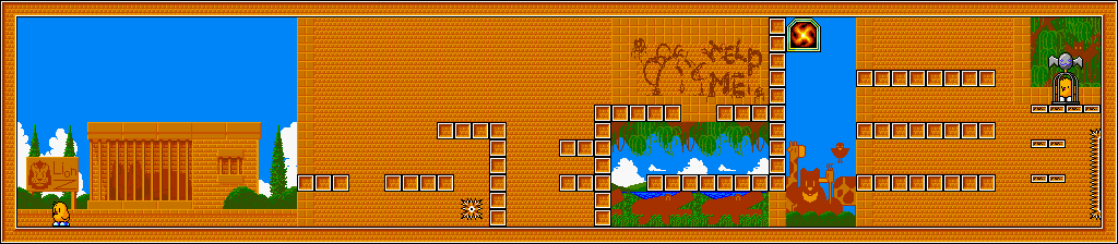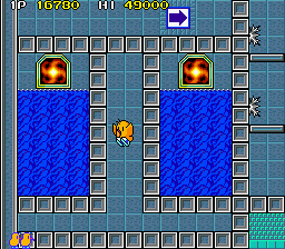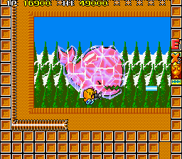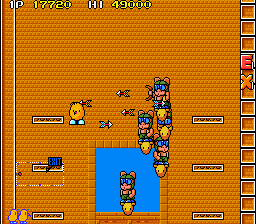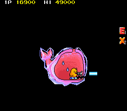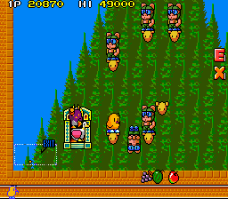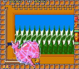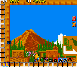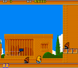 The smallest round in the entire game, Round 1-1 is the only numbered stage that doesn't scroll vertically at all. There's also no vehicles to steal here, as Tiki's got to walk before he can fly. So, with only Hermit Crabs, Missile Crabs and Blue Soldiers, Round 1-1 tries to teach you the most basic rules of the game- you can touch (most) enemies safely as it's only their weapons that kill you, you can jump through basically any platform, and that your goal is always the caged kiwi, as you're directly lead there. In a more indirect way, this is where you get a little taste of the weapons and power-up system too- there's enough enemies in your direct path to give you a Bomb just before the end of the round. So, just walk to the right, make your way up the platforms at the end, and that's your first kiwi buddy saved!
