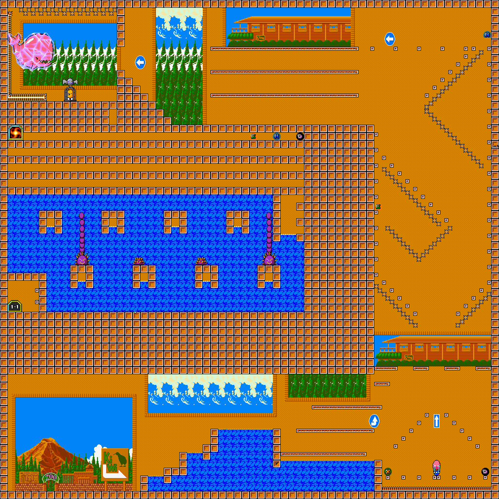 With the menagerie of meanies dealt with [I assume that's the scientific term - Ed] let's talk about the level itself, as it sets the standard for the rest of the game in terms of size- 1024 x 1024 pixels, roughly four screens wide and four-and-a-half screens tall. It also throws pretty much everything we've seen so far at the player, including a longer swimming section (which you can mostly skip, as a Penguin spawns near the mouth of the water and you can steal his Duck), a fairly gentle flying section lined by spikes (with some EXTEND letters hiding in the peripheries) and a mini-gauntlet of enemies before the boss fight. You shouldn't struggle too much here, but our main bit of advice is after the water, take the lower route and make your way around- Spearmen spawn below you on the higher path, and you don't want them to spear you. Besides, the X should get you an EXTEND if you took the warps on 1-2 and 1-3 with letters. Other than that, not much to worry about here, so scoot over to the boss for now.
