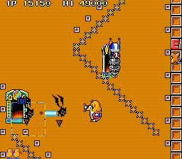 ... Ah, but if you've looked at the map, in the top-left corner of the platform area, you can see a sneaky ol' Warp hiding up there, the first of many! Shoot at that spot repeatedly to make it appear. This first one is pretty important, as it'll warp you to a boxed-away area in Round 2-1. Zoom over there to see where it leads afterwards...!