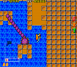 Anyway, this time you're given a choice of two other warps to take (and this includes a preview of the swimming mechanics!). The right one takes you to the top-left corner of Round 1-2, where you can grab some bonus apples and make your way back to the stage. The left one takes you to the section underneath the cage in Round 1-2, where you can get some EXTEND letters for your trouble.