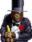 The only known professional killer who works for bananas. | He is the kidnapped son of the famous TV star, world's most intelligent chimpanzee "Mr. Happy". Arena: Airplane It's a chimp wearing a top-hat. FUN BONUS FACT: He's also wearing a bow-tie. He's a lousy shot though. | |