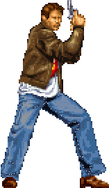 The man who would do anything from babysitting to agitating a revolution to get money. | Arena: Skyscraper The man who doesn't so much give an example of 'normal' but practically defines it, John Smith has a name so common it's often used as a placeholder pretty normal attire, and he looks like Harrison Ford. I think Namco were going for the 'All American hero' vibe here, but hilariously failed, as Johnny Boy here is wearing a daruma doll on his shirt (that you can buy a replica of nowadays). Unusual Japanese folklore aside, John Smith is a pretty standard character, willing to do anything- even babysitting- for money. FUN BONUS FACT: His running attack looks like a Dragon Punch. Shoryuken! | |