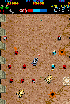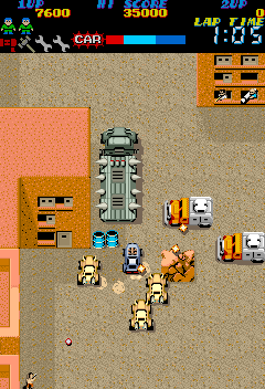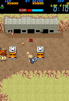 Around the mid-point of the stage is you'll get a fork in the road- go right! The path to the left is actually a tiny bit easier (it's mostly giant pits that launch cannonballs at you) and while the right isn't exactly easy- being riddled with bomb-carrying mine-carts and shell launchers that will destroy your car in one hit, and the cannon-launching pits- it does have a First-Aid Kit for you to pick up, which you're probably desperate for by this point. A full tank of gas (read: full health meter) is what'll get you ahead in this savage world, so always go for it. Both routes also have the Hammer, probably the most important item on any stage as it halves damage that you take. Combine that with two Spanner upgrades and you're far less likely to blow up. Needless to say, they're your priority on the later stages. Just pootle on through here but take note of those shell launchers- you'll be seeing them later, and you will learn to hate them. The same goes for the big rig you see in the middle screenshot- easy now, but wait until later...