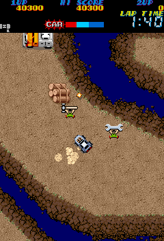 The final section of the stage is literally a run to the end- a twisty-turny road beset on all sides by cliffs and lakes. There's also a new enemy, a truck that leaves behind small bombs until you blow it up. What you really need to watch out for are the darker patches of ground by the edge- you touch them, you die, even if it looks like you can scoot across to the other side. No shortcuts, punks! This is of course why the hostage boxes are strategically placed right next to the cliffs, but the one you'll need to grab if you've made it this far without dying is the lone box on the right near the start, which has a First-Aid Kit. All you need to do here is just follow the path, staying as far away from the edges as possible! Eventually you'll reach a stone bridge with a mine in front of it (be very careful, you'll have to slip past it without falling into the water) and the final obstacle of the stage is just ahead- a mini-fortress with four cannons. Just park in front of it, pelt it with bullets, and you're good- drive on to clear the stage!