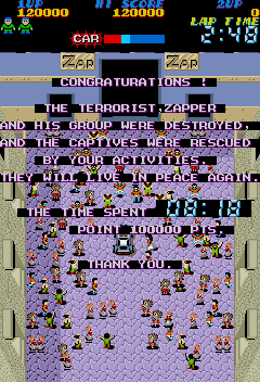 With Zapper defeated, all the hostages (damn, look at all those tiny sprites!) come out to celebrate, alongside OK Joe's family.