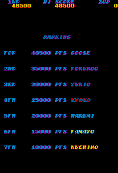 The game doesn't normally have a credits roll, but as pointed out by The Cutting Room Floor, there's a hidden one- after the ending text appears, hold Start, Left and Button 2 on the Player 1 side until the credits begin. Surprisingly, there's few pseudonyms here, it's almost all real names! Of the names here, the most notable is probably Tokuro Fujiwara, who worked for Konami briefly before leaving to join Capcom, working on some of the early arcade games including this, Commando and the Ghosts n' Goblins series, then working on a veritable ton of their home console games including Demon's Crest and Goof Troop, before leaving to form Whoopee Camp to make the Tomba games, then coming back to Capcom again. There's also Chieko Ryugo who did a lot of work in the Mega Man Battle Network series, and Shinji Kuchino who worked on several classic CPS-1 games including Forgotten Worlds and Final Fight. If there is a way to trigger this in-game, I sure don't know it, sadly!