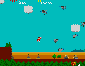 [This whole endeavour was a mistake. I should've stuck to my April Fools' Day pranks, like I'm used to. At least that way I could've found myself playing something amusingly bad, like the aforementioned Nyan Nyan Parasol (c'mon, something with a title like that can't possibly be good). Something that didn't take a game I actually like (a game that isn't The Pit, that is) and totally miss the bloody point. For this is the nature of Tokukou Shojo. As my incompetent writer cohort pointed out, this is a game based loosely off Namco's overlooked 1985 arcade game SkyKid, pictured above, which is a game where a chicken and a bluetit (I guess) try and re-enact World War II with other avian enemies replacing the Nazis. It's a pure arcade game, so there's not much to it on the surface, but your little bi-plane is a bit more athletic than ships from other shooting games at the time- when moving up and down you can shoot diagonally, and you can also do am evasive loop to hit enemies behind you and get out of trouble. There's also the TARGETS on each stage, which are enemy bases and war machines and the like, which can only be destroyed with the bomb- you only get one per TARGET, you have to grab it mid-mission, and since it uses the loop button you can't hit enemies behind you until it's dropped. It's minimal- the enemies aren't that numerous but to be able to hit them all requires dexterity, especially the ones behind you- but what it does it does well enough, and it's quite fun in co-op mode mostly because you can dick with the other player by shooting them. It's got charm, it's got a unique angle, and it's got moxie.]