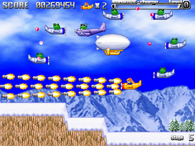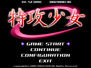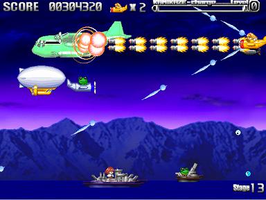 [The second game on this low-rent, rat-hole website to be based on a Key visual novel, later an anime (and yes, we're linking to Colony Drop's article on Key again) Tokukou Shojo- developed by Daisessen- is Sky Kid with all the love ripped out of it, replaced with the cast of Kanon (which, depending on which version you play, is a considerably filthier game than the one Tomoyo Fighter Perfect was based on, Clannad). The basics are almost the same- shoot, loop-de-loop, gun down the enemy and grab the bomb to destroy the enemy base/warship before landing safely- but there are three big changes, two of which kill everything. The first change is that there are other girls in little planes like yours hidden in blimps scattered across each stage- grab thme and they'll dock onto your ship, giving you their unique shot power, and the person you control in this bizarre avian conga lane changes at the start of every stage. The girls contribute to the sole minor change (as well as loop, holding the second button charges a Kamikaze Meter- let go and one or more girls will fly out, which is a powerful attack but you'll have to grab the girl again afterwards) and also lead to the real killer. Each girl has a ridiculously powerful main attack which will rip the advancing enemy army to shreds. The starting girl (who we've taken to calling Uguu Girl around the office because that's apparently the noise she makes in Kanon and we're sure as hell not researching this any further than necessary) has a diagonal attack that can kill enemies behind you (the deadliest kind in Sky Kid), one of the others throws out homing projectiles (which are all copies of the main character from Rabio Lepus/Rabbit Punch for some reason) and whether they're all connected or not, their firepower overwhelms the enemy.]