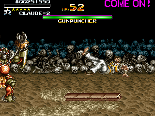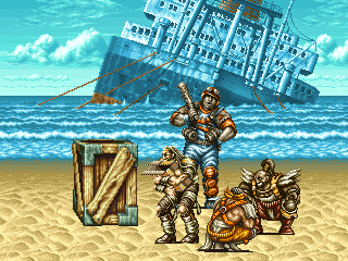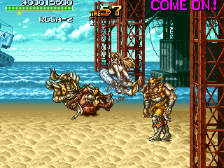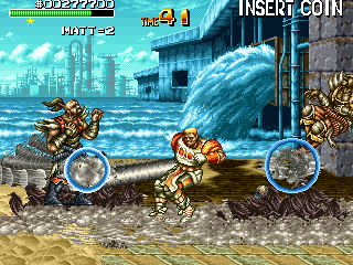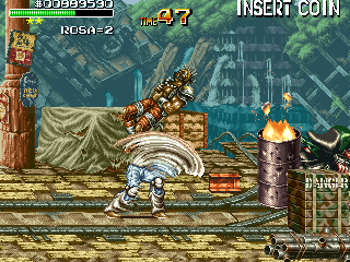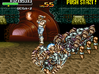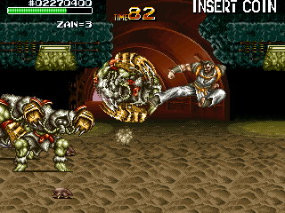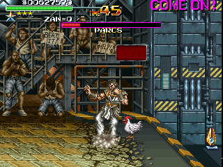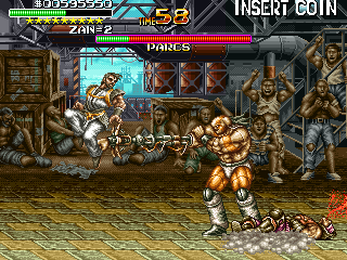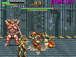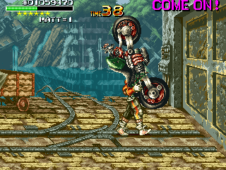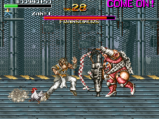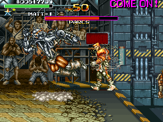 ... Our first boss, Parcs! As with all the bosses, he's arbitrarilly renamed in the World version, so we'll be providing both but mostly refer to the Japanese name. So, Parcs (Japan) / Cue Ball (World) is a big ol' cyborg who talks loudly and uses his bionic arm to smack you. In this first phase of the fight, he's not much trouble- throw the jeep at him, then grab and throw him when you have the chance (just keep away when he's using his bionic arm, that thing stings!). Once you get him into his red lifebar, he'll stand at the edge of the screen and start roaring, so lamp him and...