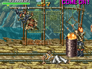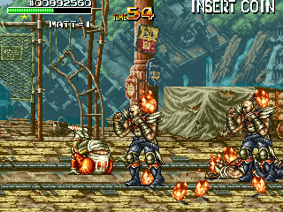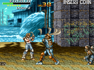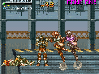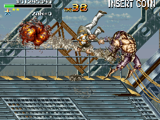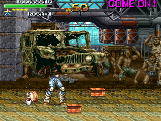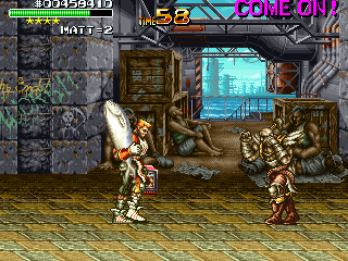 Just a little way in, you'll find one of the showpiece weapons of the game, the steel girder. It's embedded in the ground, so you can either tap the Attack button and lift it out (which will let you use it a few more times, but makes you vulnerable to attack) or just punch it (which weakens and makes it last less hits, but is easier to do). You can either press Attack to swing with it once, or press Attack then tap the opposite direction to swing it round and cover both sides (Matt, being the powerhouse, can swing the girder a lot faster than Zan or Rosa). However, you only get a couple of goes with it (determined by how you got it out the ground) before your character lobs it off-screen. I guess they want to play fair? A little further on you'll find a concrete pole which works the same way, but actually gets shorter each time you land a hit- you'll get less hits out of it if you punch it out the ground instead of lifting it.