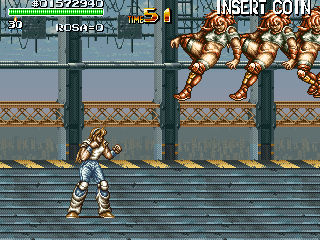 Sadly, it's not the kind of lift stage where you can throw enemies off the lift, but that's OK, we'll be able to do that in the next section. What we do get is a new enemy type, Fox- a cat lady who is basically the Roxy/Poison of the game, specialising in jump kicks and just-barely-there clothing. And there's a lot of them here- they're the only enemy in this area until the very end! Luckily you'll eventually get a steel girder from the heavens to help you out, but the main tip here is to not let yourself get surrounded- they will swarm you if you let them.