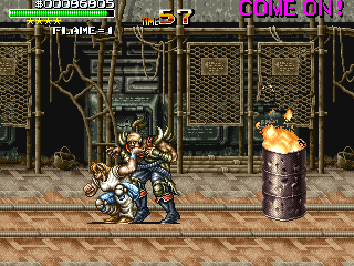 In any case, the actual stages are the same. Early on you're introduced to a new weapon, the flaming torch- you'll find them in flaming drums that you can either hurl as a weapon first then use the torches, or just punch it to get at the torchy goodness within. Either way, you get a load of them but they're only throwing weapons, so aim carefully. Also don't bother throwing them at enemies who haven't got up yet- it won't hit them! The Doobys you'll find here also get to play with these and can set you on fire, so watch out. You're also introduced to the box-carrying Brads who either have yummy treats or drop grenades and kill themselves- in either case, one hit and they're out. A little later on there's a massive pile of weapons, including a pile of steel poles, a box of grenades, a drum of torches and a motorcycle that you can totally grab and use... Although it's actually tricky to get at it- if you or an enemy gets slammed/thrown into the weapons pile or you punch the drum, it'll set of a chain reaction that blows up the motorcycle. It's one that only very, very careful players will get to toy with.